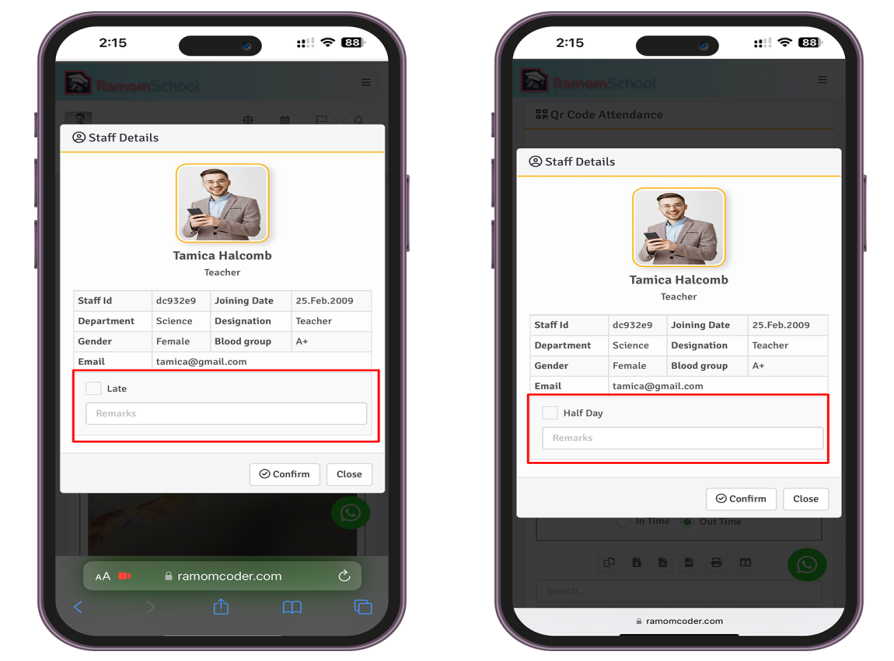 Ramom School QR Code Attendence addon adds QR Code attendence module in “Ramom Multi Branch School Management System”. Using this addon students and employees attendance can be taken through smartphone(Android and IOS) camera or webcam. Also you can track employees In Time and Out Time. Overcome the hurdles involved in tracking attendance by using our QR code attendance. Now, you can verify and track your attendance super-smoothly. The user attendance QR code is secure, as it is printed in encrypted condition.